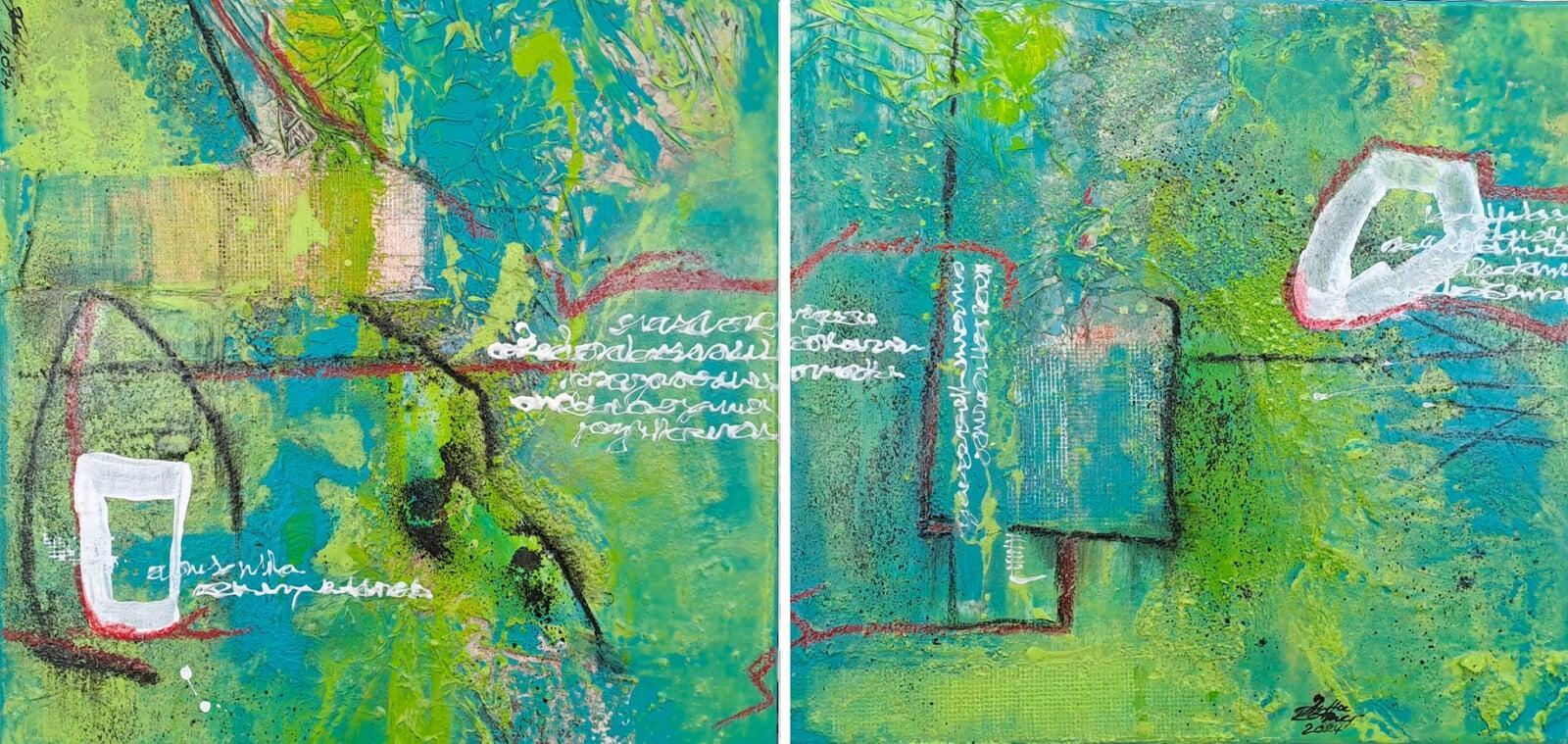 Mixed-Media, Acryl auf Leinwand, 2-teilig, je 50 x 50 cm,